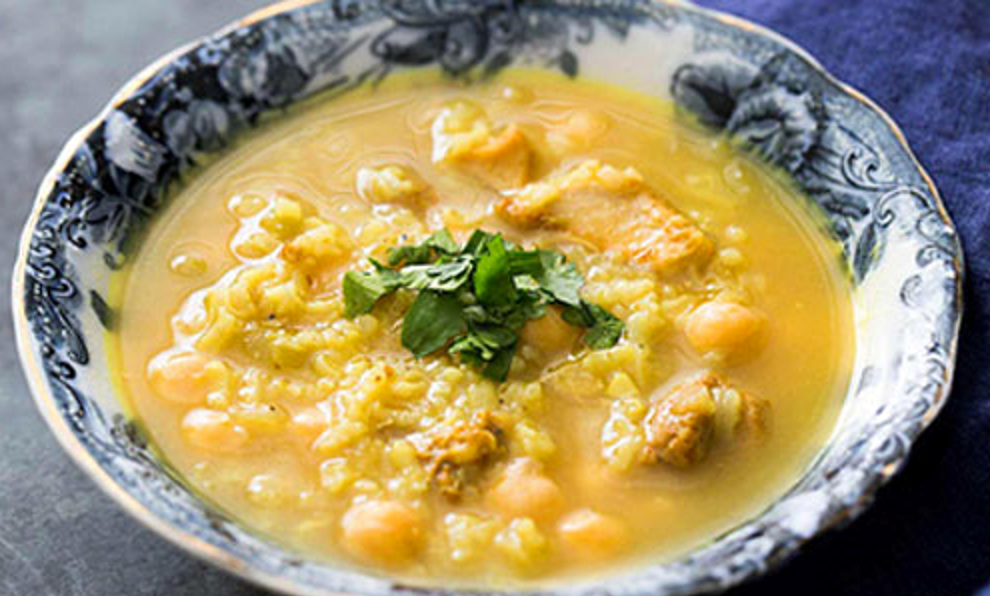 اول از همه سس مخصوص سوپ را آماده کنید. رب گوجه، پودر پاپریکا، زیره سبز، تخم گشنیز، پودر سیر و کمی نمک را در کاسه کوچکی بریزید و به خوبی با هم مخلوط کنید. آب مرغ را همراه با ایـــــن سس در قابلمه بزرگی بریزید و روی شعله قرار دهید تا جوش بیاید. سپس شعله را کم کنید. درب قابلمه را ببندید و بگذارید 15 دقیقه روی شعله ملایم بماند. پس از آن نخود و مرغ پخته، نمک و قدری فلفل سیاه اضافه کنید و کمی صبر کنید تا همه مواد داغ شوند (5-10 دقیقه).