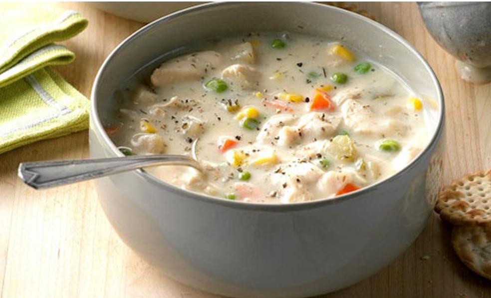 اگر مرغ شما آماده نیست اول از همه مرغ را در مقدار زیادی آب بپزید. طوری که پس از پخته شدن مرغ حداقل دو پیمانه آب در قابلمه باقیمانده باشد. سپس مرغ پخته را خرد یا ریش ریش کنید. یک پیمانه مرغ خرد شده و دو پیمانه از آب مرغ را برای تهیه سوپ جدا کنید. روغن زیتون را در قابلمه بزرگی بریزید و روی شعله قرار دهید تا داغ شود. پیاز را خرد و سیر را رنده کنید و آنها را داخل روغن داغ شده بریزید.حدود ۲ دقیقه تفت بدهید تا پیاز شفاف شود ولی قهوهای نشده باشد. هویج، فلفلدلمهای و کرفس را به صورت نگینی خرد کنید و به قابلمه اضافه کنید. یکی دو دقیقه دیگر تفت بدهید تا سبزیجات نرم شوند. کره را اضافه کنید و اجازه بدهید ذوب شود، سپس آرد را اضافه نمایید. هم بزنید تا با بقیه مواد مخلوط شود. ۱ دقیقه دیگر به تفت دادن ادامه بدهید و مرتب هم بزنید. آب مرغ را داخل قابلمه بریزید و هم بزنید تا آرد در آب مرغ حل شود. سپس شیر را اضافه و مخلوط کنید. حال پودر سیر، آویشن و نمک و فلفل را اضافه کنید. نخود فرنگی و مرغ خرد شده را نیز داخل قابلمه بریزید و هم بزنید. بگذارید سوپ روی شعله ملایم ۴–۵ دقیقه گرم و غلیظ شود اما نگذارید بجوشد (حباب ظاهر نشود). در این مدت مرتب سوپ را هم بزنید تا ته نگیرد. وقتی سوپ به غلظت دلخواه شما رسید آن را بچشید و نمک و فلفل را تنظیم کنید. سوپ کرم مرغ را داخل کاسههای سوپخوری بریزید و رویش نان کروتان و کمی آویشن بریزید و آن را نوش جان کنید.