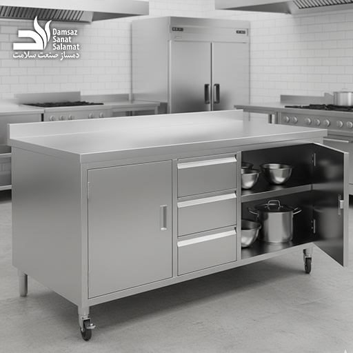 این نوع میزها علاوه بر سطح کار، مجهز به کشو و کابینت هستند که برای نگهداری ابزار و لوازم ضروری مناسب است. وجود کشو باعث دسترسی سریع به اقلامی مانند چاقو، کاردک، دستکش یا ظروف یکبارمصرف میشود و از شلوغی سطح میز جلوگیری میکند. این مدلها به ویژه برای آشپزخانههای پرتردد که تجهیزات کوچک زیادی دارند، مزیت عملی بزرگی محسوب میشوند.